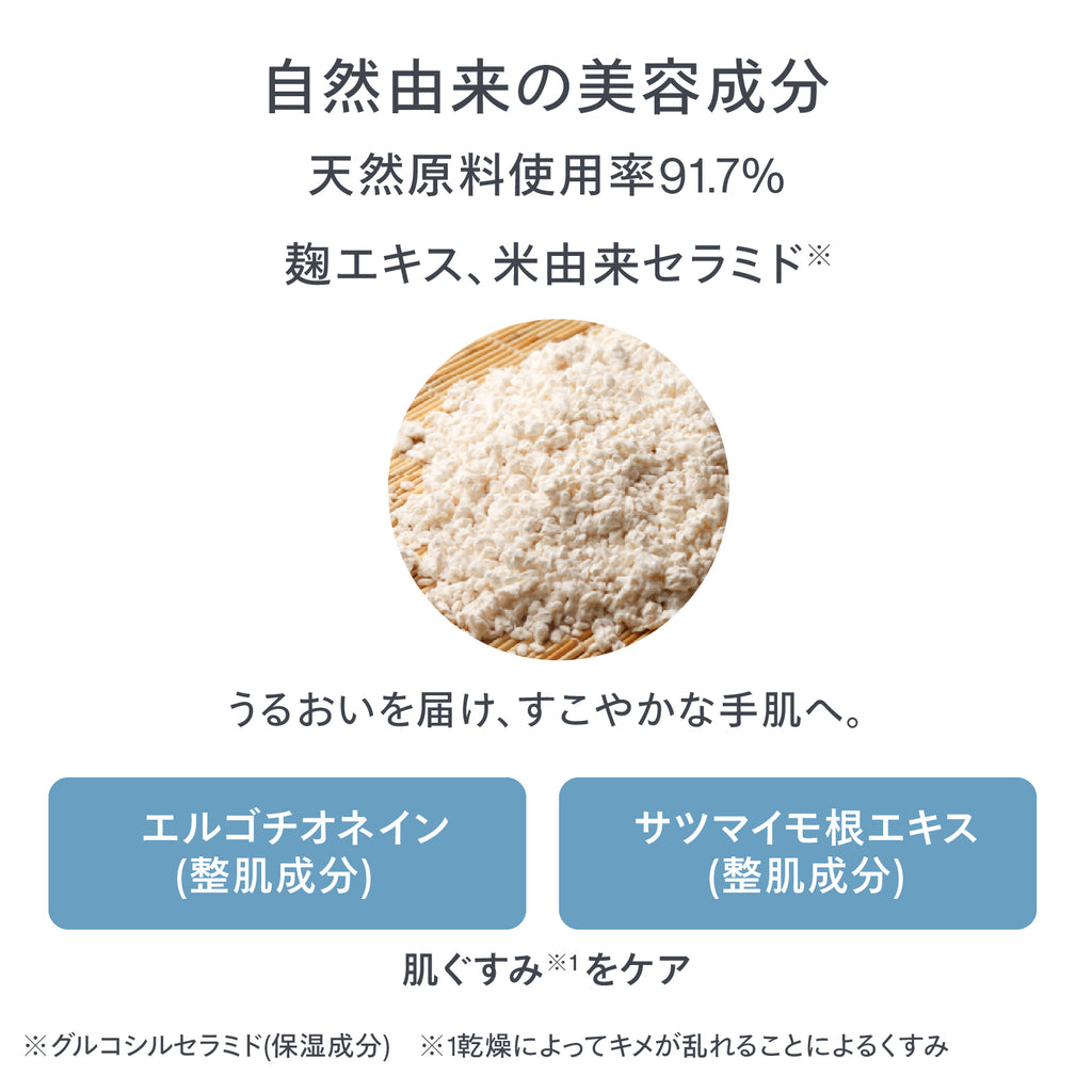 ○独自開発の「麹エキス*4」と米由来セラミド*5がうるおいを届け、すこやかな手肌へ。