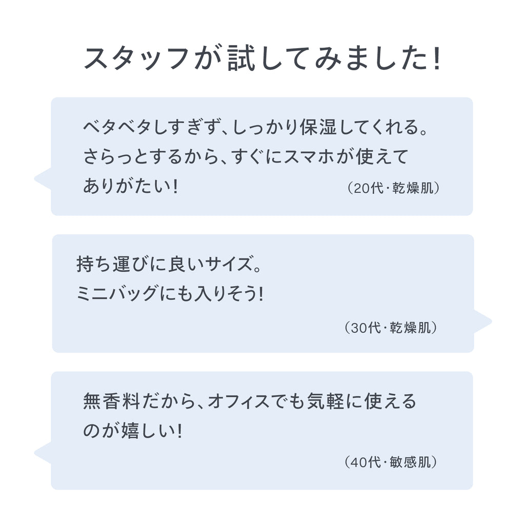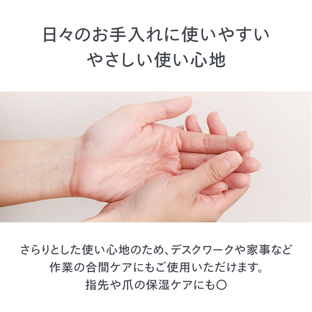 さらりとした使い心地のため、デスクワークや家事など作業の合間ケアにもご使用いただけます。指先や爪の保湿ケアにも〇
