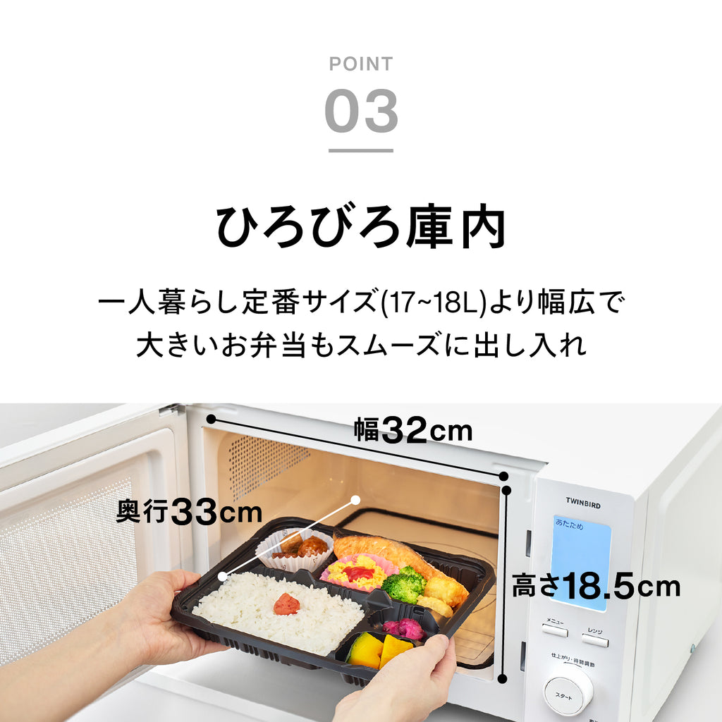 フルホワイトデザインがインテリアに馴染む、ツインバードのセンサー付フラット電子レンジです。庫内がフラットで、汚れてもサッと一拭きでお手入れできます。食材の温度を検知して適温にあたためる、赤外線センサーを搭載。快適でおいしいくらしをお手伝いします。