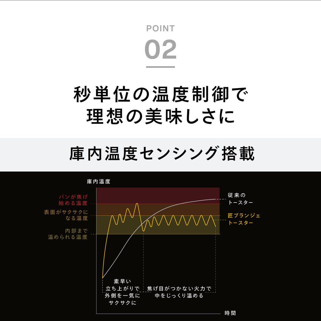 匠が認めた魔法の温度バランスを作り出すために、センサーが秒単位で温度を計測。パンを含む庫内の状態を見極め続けます。