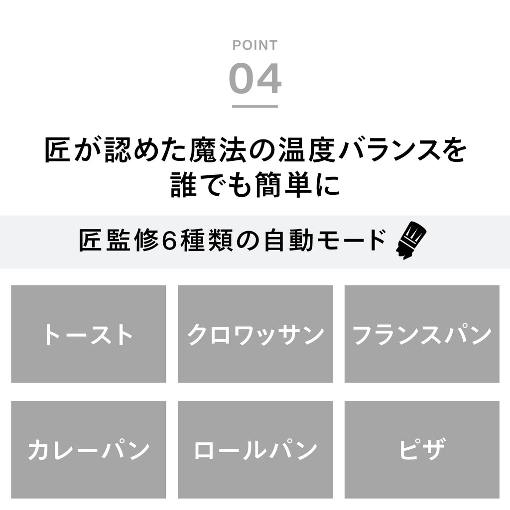 世界一に輝いた※パン職人浅井一浩氏と共同開発。秒単位の温度センサーと遠近2種類のヒーターが、自動でまるで“焼きたて”のおいしさを叶える、匠が見守るトースターです。感動のおいしさを同時に味わえる、4枚焼き対応サイズ。
